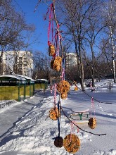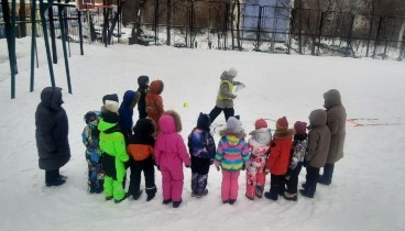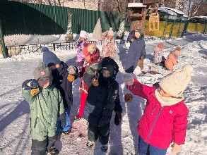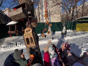 Во время прогулки юные воспитанники заботливо развесили вкусное угощение и наблюдали за тем, как пернатые дружно слетелись на обед.