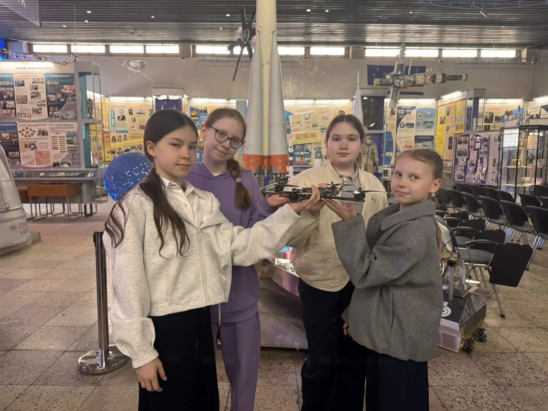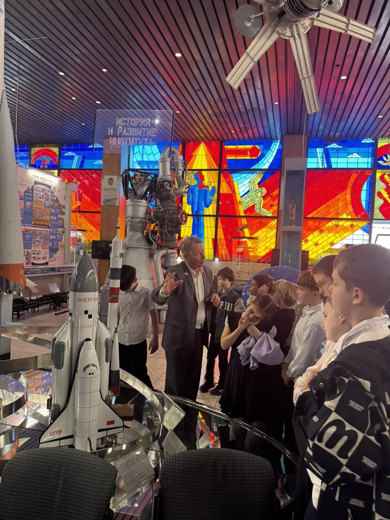 Ребята увидели настоящий спускаемый аппарат, скафандр, ракетные двигатели и много других интересных экспонатов; узнали, как живут и работают космонавты на орбитальной станции, чем они питаются и как спят в невесомости.